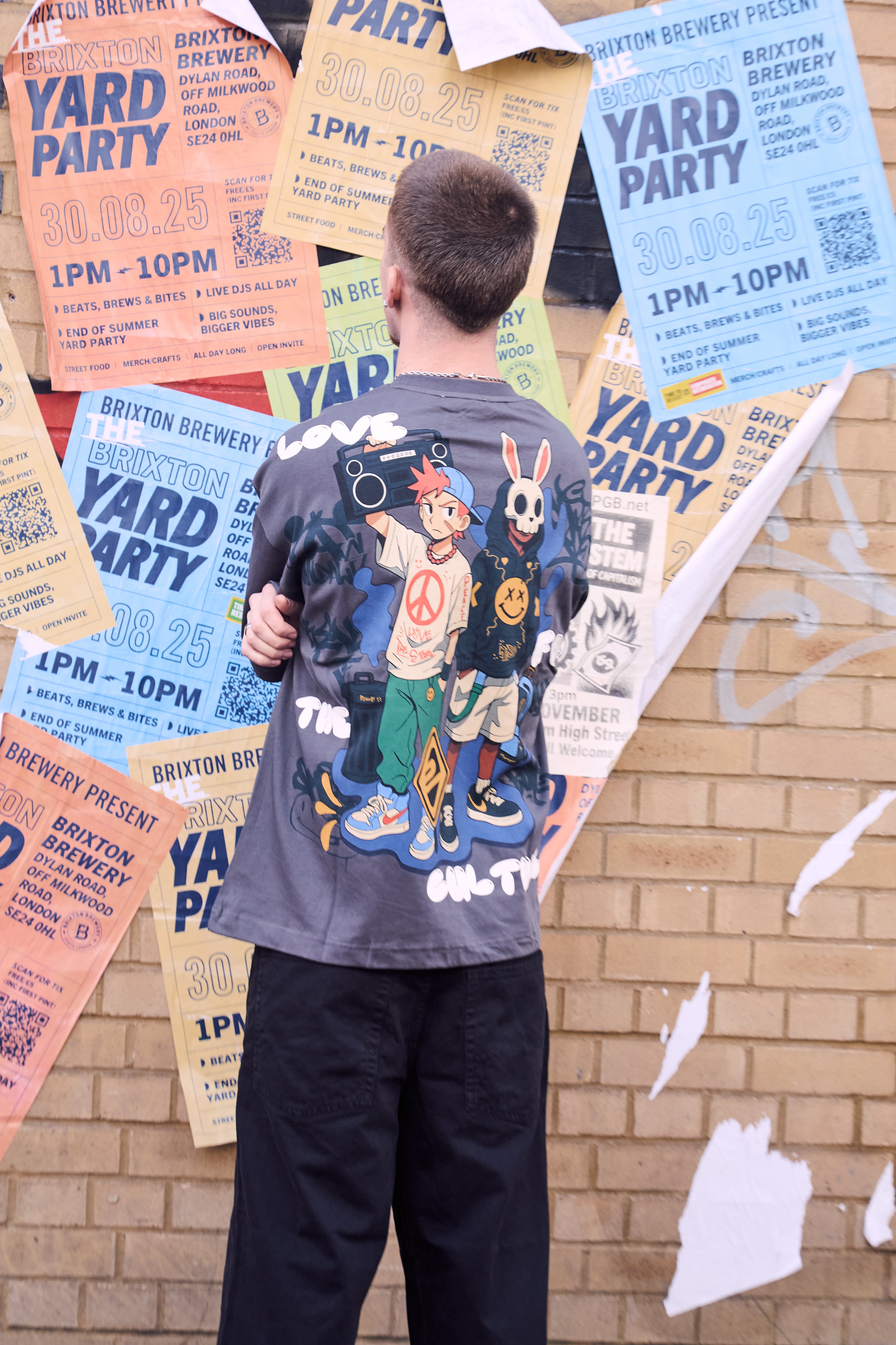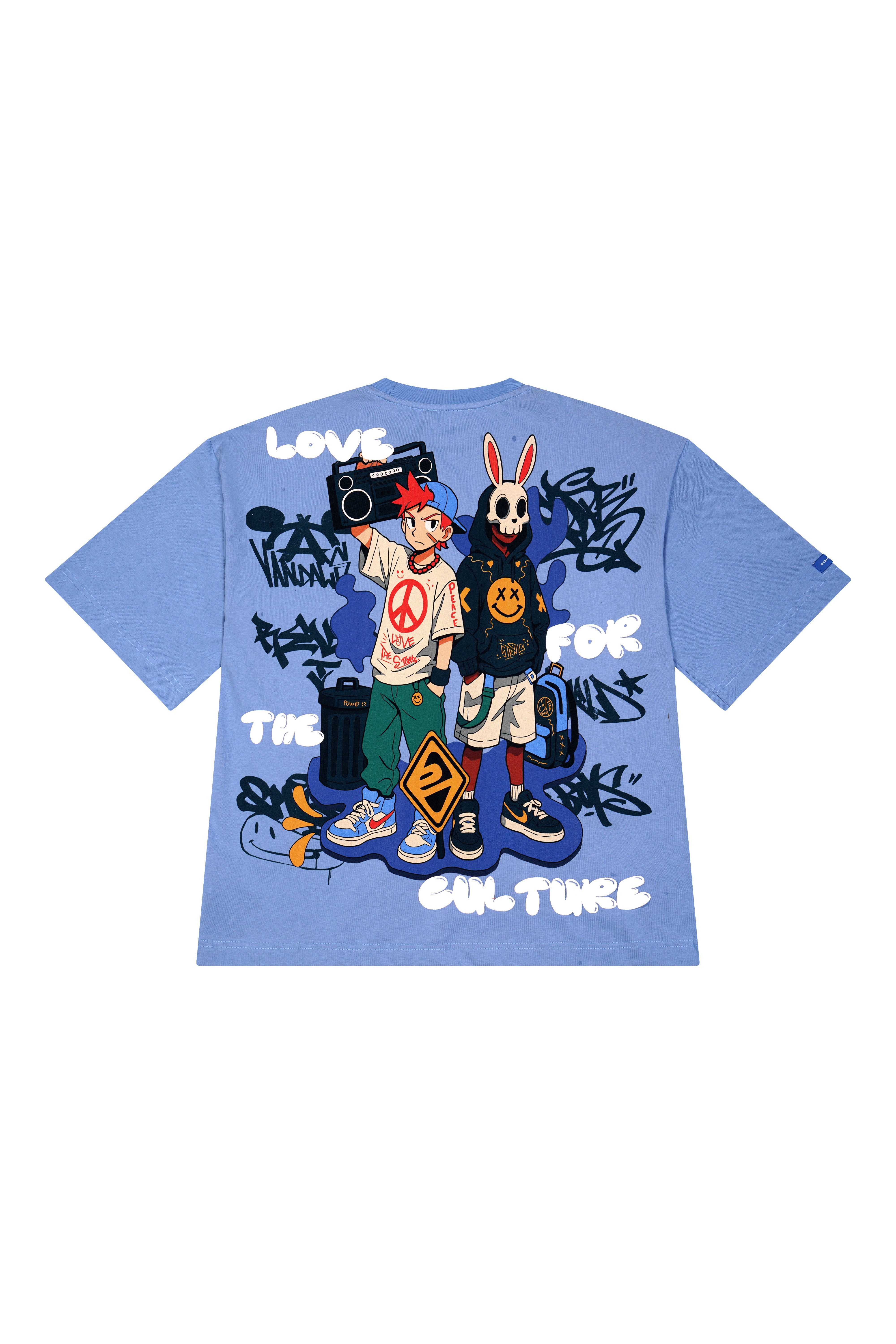 This masterpiece T-shirt captures the duality of the streets — joy and rebellion, innocence and edge, past and future standing side by side. The artwork hits heavy on the back: raw characters, graffiti language, sound systems, symbols of resistance and expression. It’s culture as lived, not explained.
